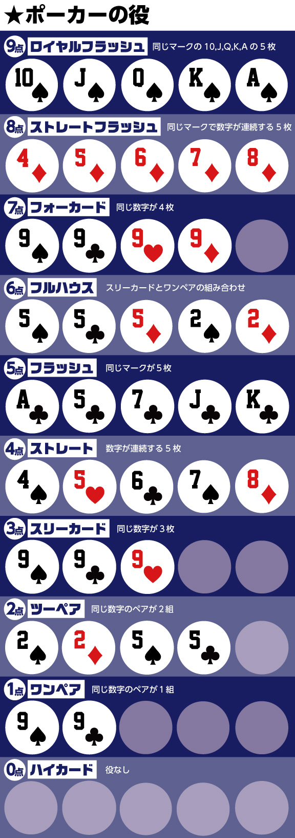 ④プレイヤー全員の手札交換が完了したら、今回のゲームは終了です。手札を公開し、自分の手札の点数(ポーカーのカード役とラーメン役の合計)を計算します。