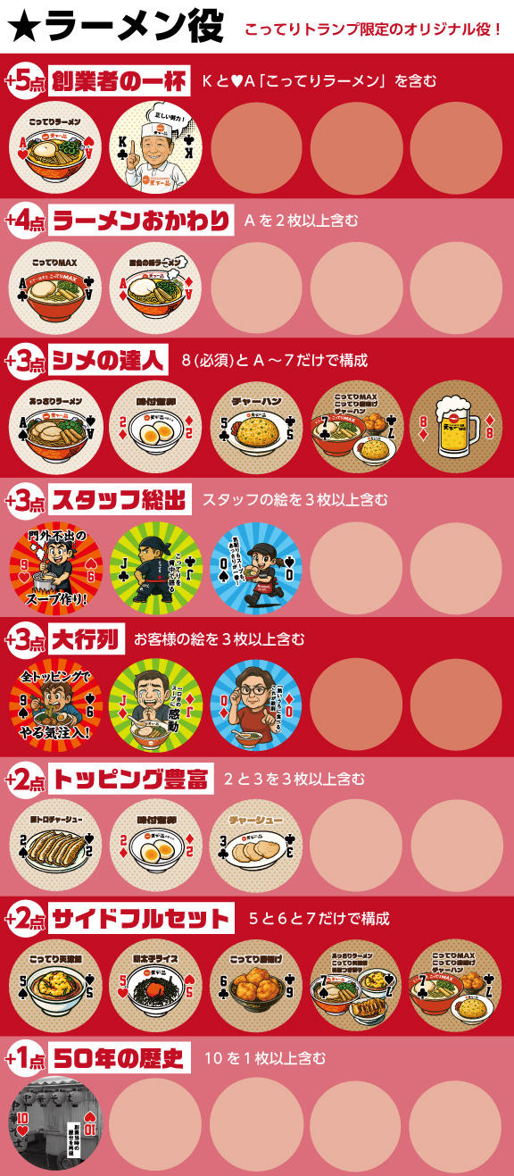 ポーカーの役に、こってりトランプオリジナルの【ラーメン役】が加わった、新感覚ポーカーゲーム。プレイヤーはポーカーのようにカード役を揃えつつ、「セットとしての完成度」や「天下一品の魅力」で構成された【ラーメン役】の加点で勝利を競います。